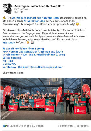 Bei der Kampagne „Ja zur einheitlichen Finanzierung“ organisierten wir Aktionen, leiteten das regionale Komitee des Kantons Bern, unterstützten Basel-Stadt und trugen aktiv zur nationalen Mobilisierung bei – mit einem erfolgreichen Ergebnis von 53,31 % Ja-Stimmen.